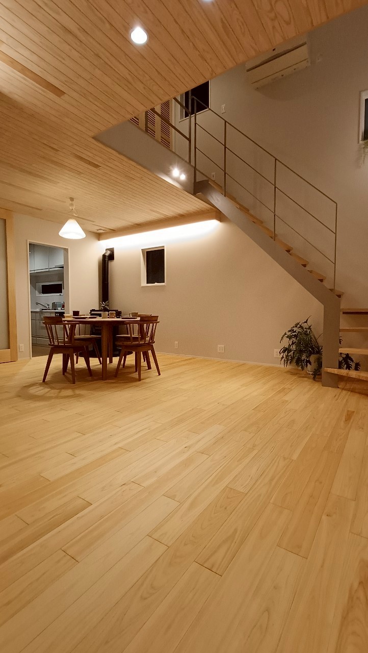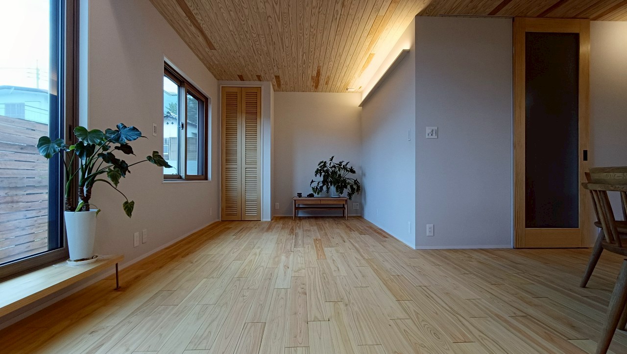 室内には檜の無垢フローリングと天井には杉板を貼り、木が奏でるあたたかみのあるインテリアです。
