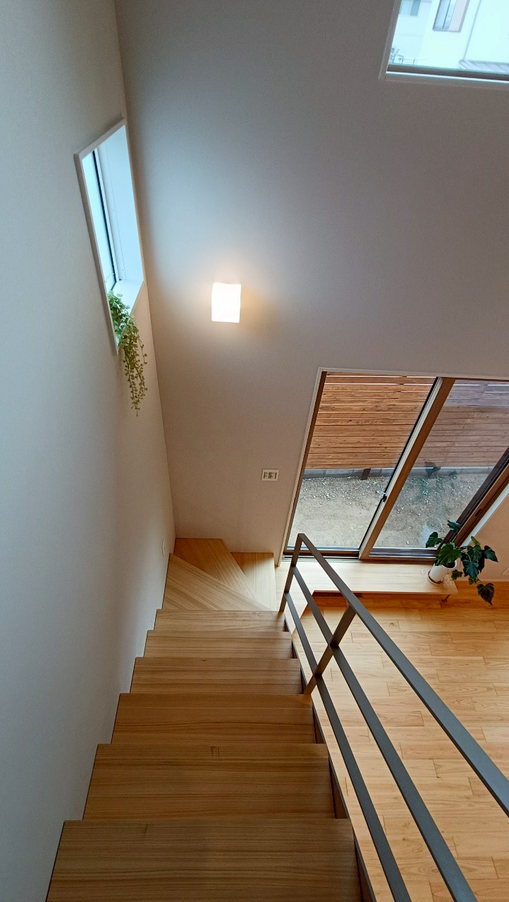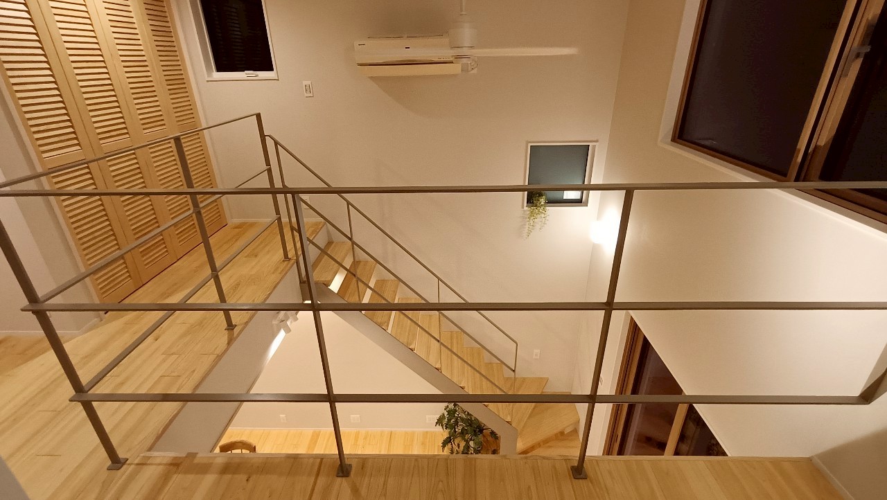 空間の広がりと採光を多くとるために、吹き抜けを設け、そこへ階段をつけることで1・2階共につながる空間を演出し、家族の気配を感じられる間取りになりました。